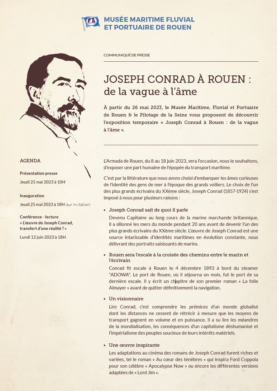 Initiée en 1989 pour célébrer le bicentenaire de la Révolution française, l’Armada de Rouen revient épisodiquement dans le port normand : elle y sera à nouveau présente en 2023, du 8 au 18 juin. La publicité relative à cette grande fête maritime et populaire dépasse le cadre de notre revue, mais il nous a paru singulier de signaler à nos lecteurs la tenue d’une exposition organisée par le Musée maritime et portuaire de Rouen (sur les quais) et le Pilotage de la Seine : « Joseph Conrad à Rouen : de la vague à l’âme ».