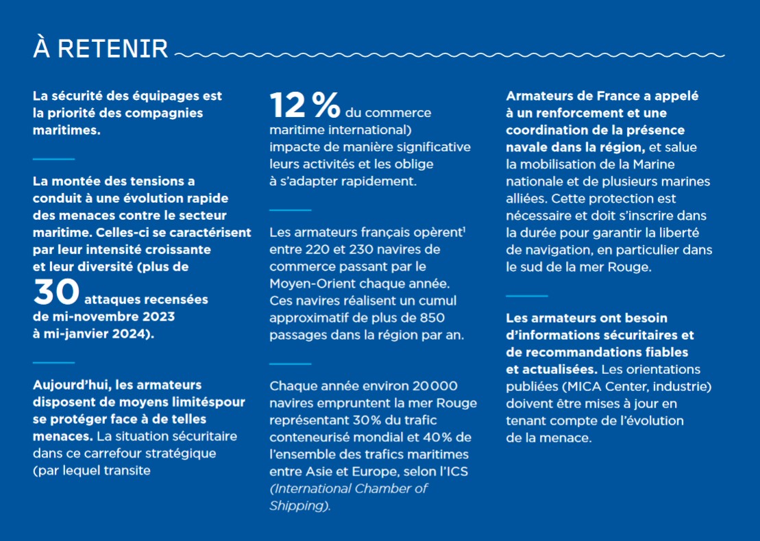 La France a ainsi repositionné la frégate Languedoc en mer Rouge fin 2023, puis déployé la frégate Alsace début 2024, en protection des navires de commerce en réalisant des accompagnements. Le MICA Center7, sollicité par Armateurs de France, a également com-