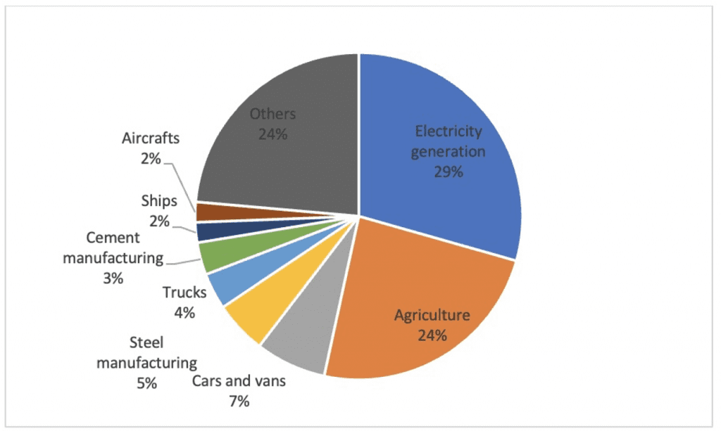 Deux secteurs à eux seuls représentent plus de 50% du total des émissions : la production d’électricité et l’agriculture représentent ensemble 53% de toutes les émissions ! Si on y ajoute les voitures et les camionnettes, on arrive à 60% de toutes les émissions. Donc en ayant recours à nouveau à des calculs simples on constate qu’une diminution de 10% des émissions liées à la production d’électricité ferait plus que compenser l’ensemble des émissions du transport maritime ! Une même baisse de 10% appliquée à la production d’électricité et à l’agriculture compenserait largement les émissions combinées du transport maritime et aérien !