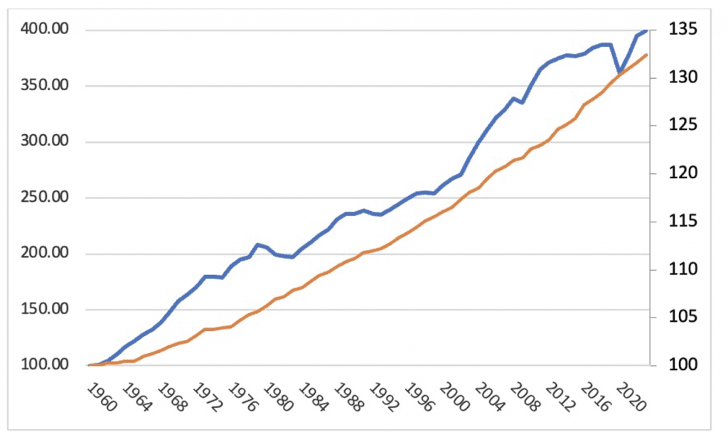 Le diagramme ci-dessus montre les émissions de CO2 mondiales base 100 en 1960 (courbebleue /axe vertical gauche) et la concentration de CO2 dans l’atmosphère également base 100 en 1960 (courbe rouge/axe vertical droit).