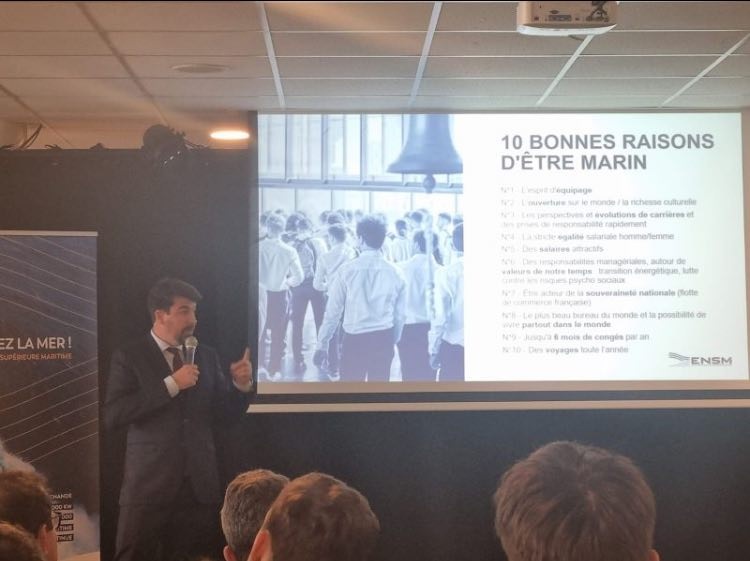 La première intervention à l’Institut Saint Joseph au Havre François Lambert, Directeur Général de l’ENSM et Directeur de la Fondation ENSM, accompagné de Guillaume de Beauregard, directeur du site du Havre, d’Arnaud Le Dimna, pilote du Havre et ancien élève de l’ENSM, d’Hugo Le Pape, ainsi que de Florian Batrel et Charles Henri Caubrière, élèves de l’ENSM et anciens élèves de l’Institut Saint Joseph, ont eu le plaisir de débuter la manœuvre, accueillis par Guillaume Demeillers, directeur de l’établissement. Devant un public de Terminale, candidats pour intégrer l’Hydro et de Premières qui s’interrogent encore sur leurs choix à venir, les messages de promotion de l’École et des métiers de la marine marchande et de l’ingénierie en génie maritime ont été passés.