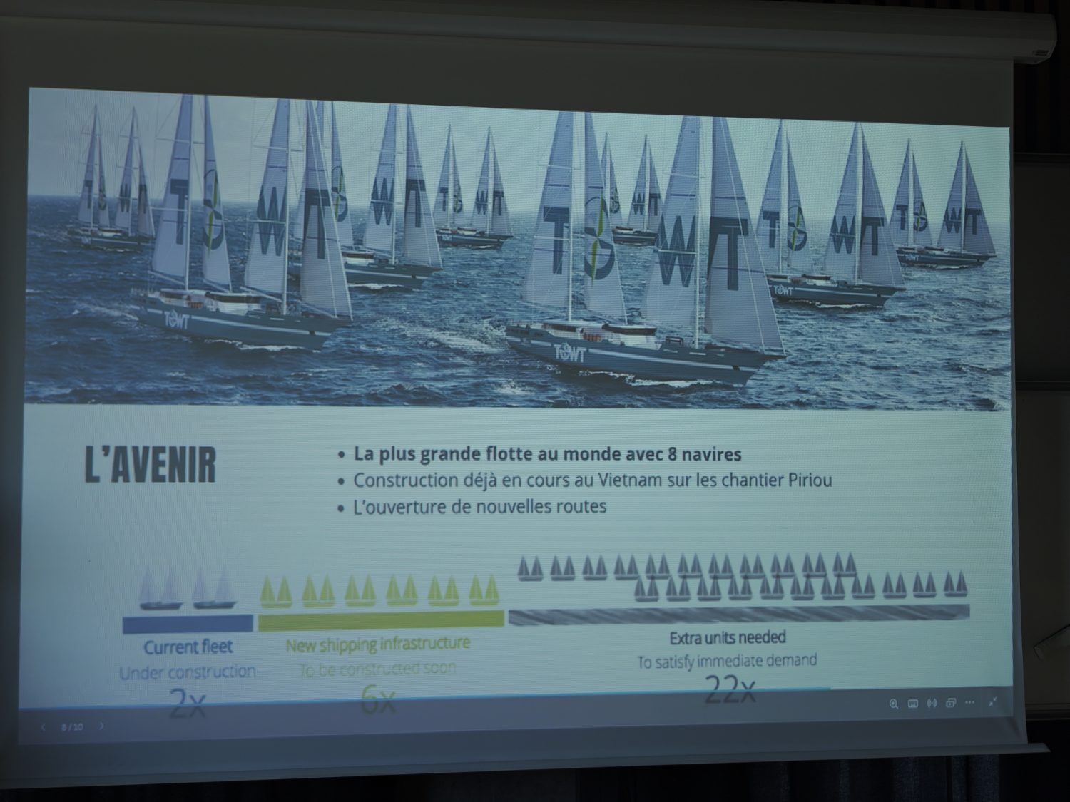 TOWT a d’ores et déjà annoncé la commande de six navires supplémentaires propulsant l’entreprise à la tête de la plus grande flotte de voiliers-cargos au monde et leader mondial du transport de marchandises à la voile d’ici 2027. Avec huit navires, TOWT contribuera, en transportant environ 200 000 tonnes de marchandises chaque année, à économiser environ 40 000 tonnes de CO2.