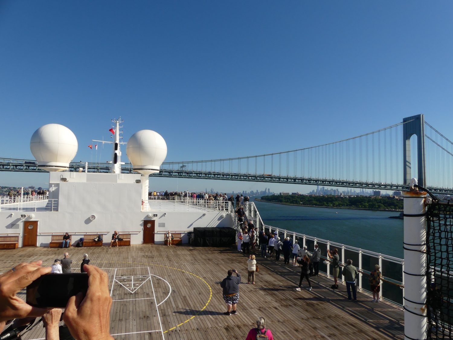 Il est à peine six heures lorsque j’effectue ma – désormais habituelle – promenade sur le pont supérieur, avant de rejoindre le self-service pour le petit-déjeuner. Même si notre accostage n’est prévu qu’à midi, une grosse centaine de passagers savoure son café ici-haut, dans la fraîcheur matinale. L’horizon laisse déjà apercevoir le Pont Verrazzano, coiffant l’entrée de la Baie de l’Hudson. Il faut compter environ quatre heures pour traverser la baie : franchissement du pont vers 8h.