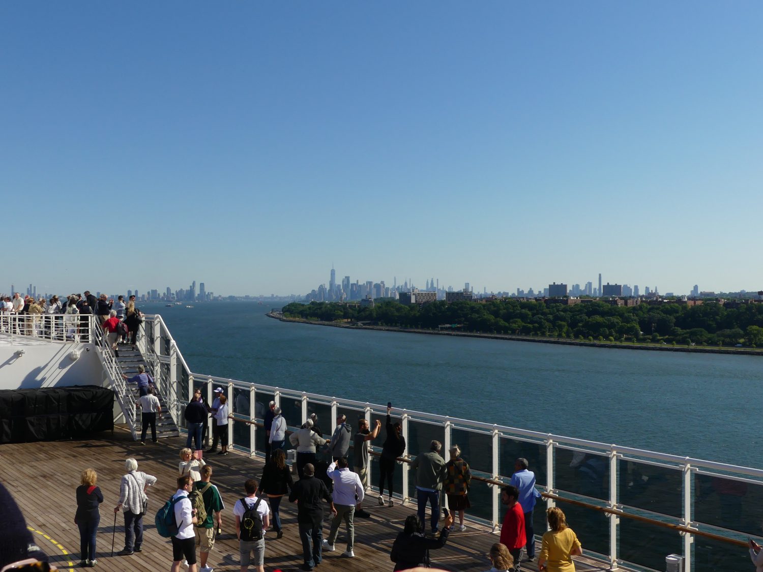 À l’approche de la Big Apple, chacun peut déjà ressentir l’atmosphère frémissante à bord. Même sur un paquebot effectuant une douzaine d’escales annuelles à New York, l’émotion reste palpable. Nos horaires sont aussi favorables que la météo d’ailleurs : sous un ciel dénudé de tout nuage, le tablier du pont brille déjà. Les amateurs de photos avaient déjà fait leur repérage : une arrivée plein ouest avec un soleil matinal est idéale. Ils sont déjà nombreux, téléphone ou appareil-photos dégainé, en pleine balance des blancs.