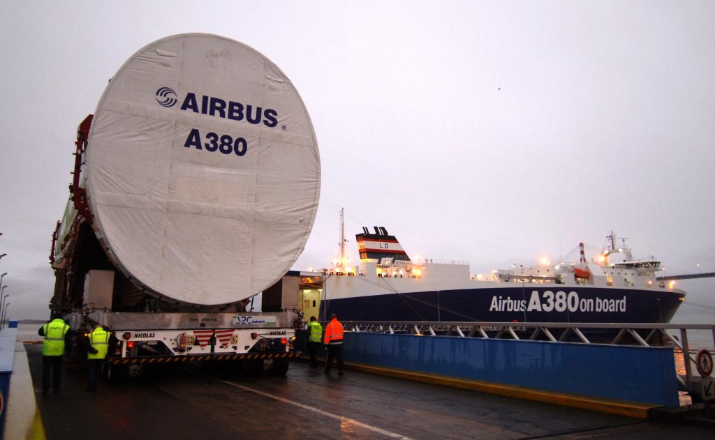 BORDEAUX 03 DEC 2007 – Les éléments du premier Airbus A380 destiné à Air France ont été déchargés à Pauillace, près de Bordeaux en début de semaine. Cet avion, qui nomme provisoirement MSN 033, sera terminé et livré à Air France en 2009. Construits par les différents sites Airbus d’Europe, ces éléments sont acheminés par le mer à bord du Ville de Bordeaux, navire spécialement conçu pour ce transport. Photo Eric HOURI Photo : En 2002, est créé Fret-Cetam, joint-venture entre LDA et l’armement norvégien Hoëgh, qui met en service en 2004 le premier roulier transporteur d’Airbus, le Ville de Bordeaux. ©JMEH