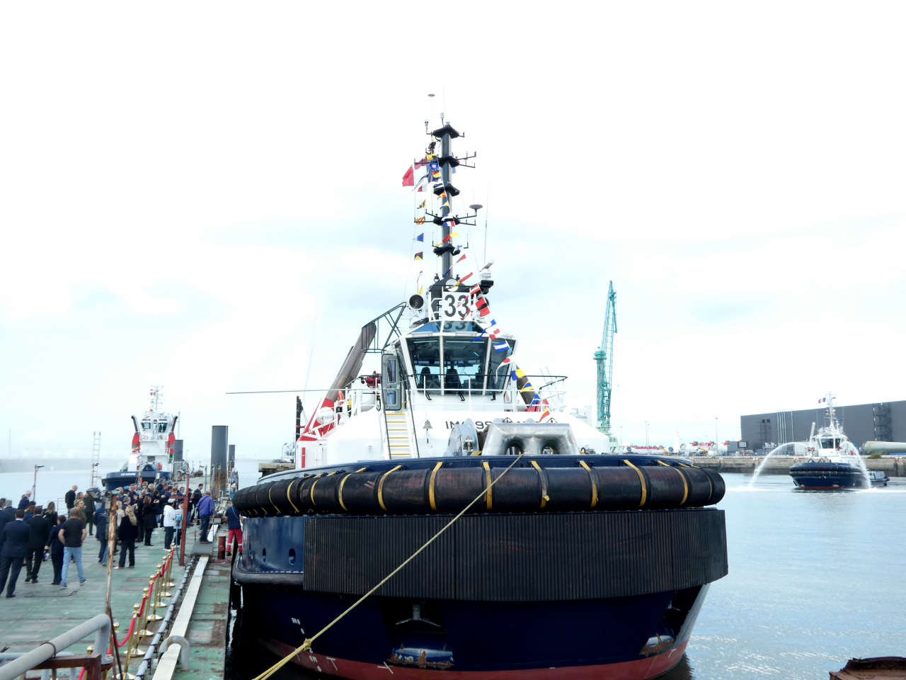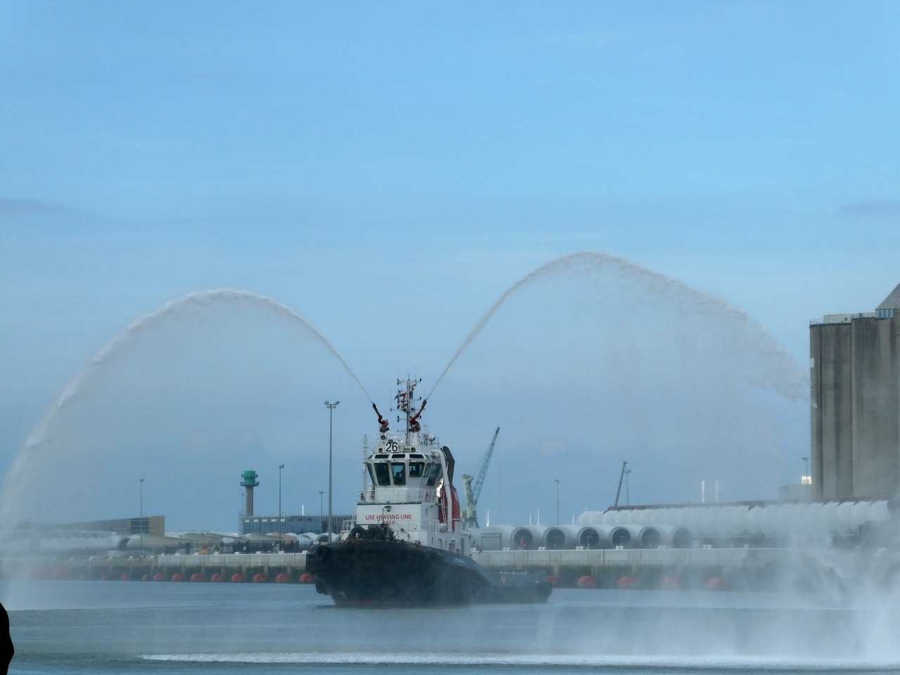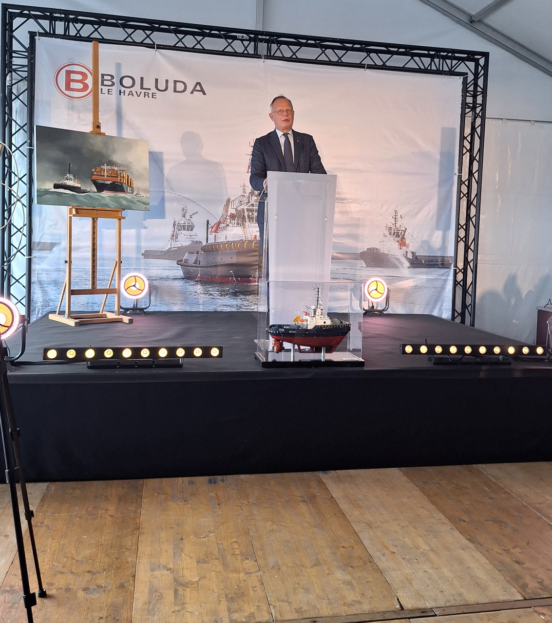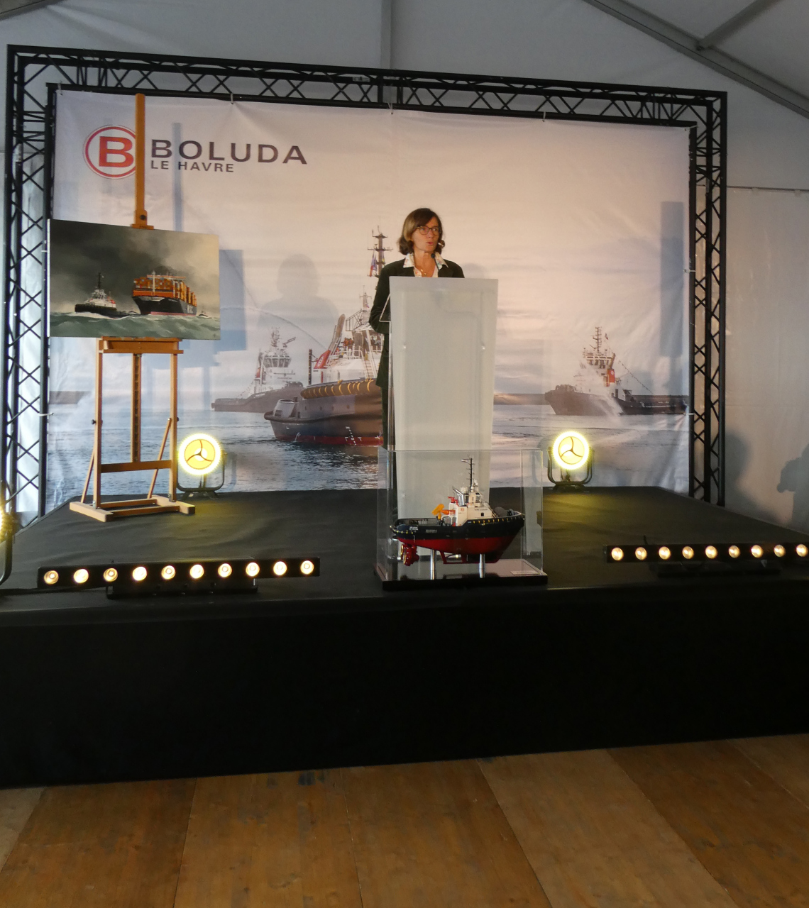 Lundi 29 septembre, l’ensemble de la communauté havraise s’est réunie pour la bénédiction du tout dernier remorqueur de la société BOLUDA TOWAGE FRANCE mis en service sur son site du HAVRE. Une cérémonie honorée de la présence du Président de BOLUDA, Vicente BOLUDA, lors de laquelle Laurent MENAGER, Directeur Général de BOLUDA TOWAGE FRANCE, Agnès FIRMIN LE BODO, Marraine du navire et Edouard PHILIPPE ancien Premier Ministre et maire du HAVRE ont successivement pris la parole avant une bénédiction sous les jets d’eaux nourris par la flotte du site du HAVRE.