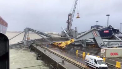 Rupture d’amarrage + vent = un portique à terre !! La formule est malheureusement récurrentes dans les ports quand des conditions de vent deviennent limites par rapport à la tolérance maximum des treuils d’amarrage des navires. Lundi 9 décembre…